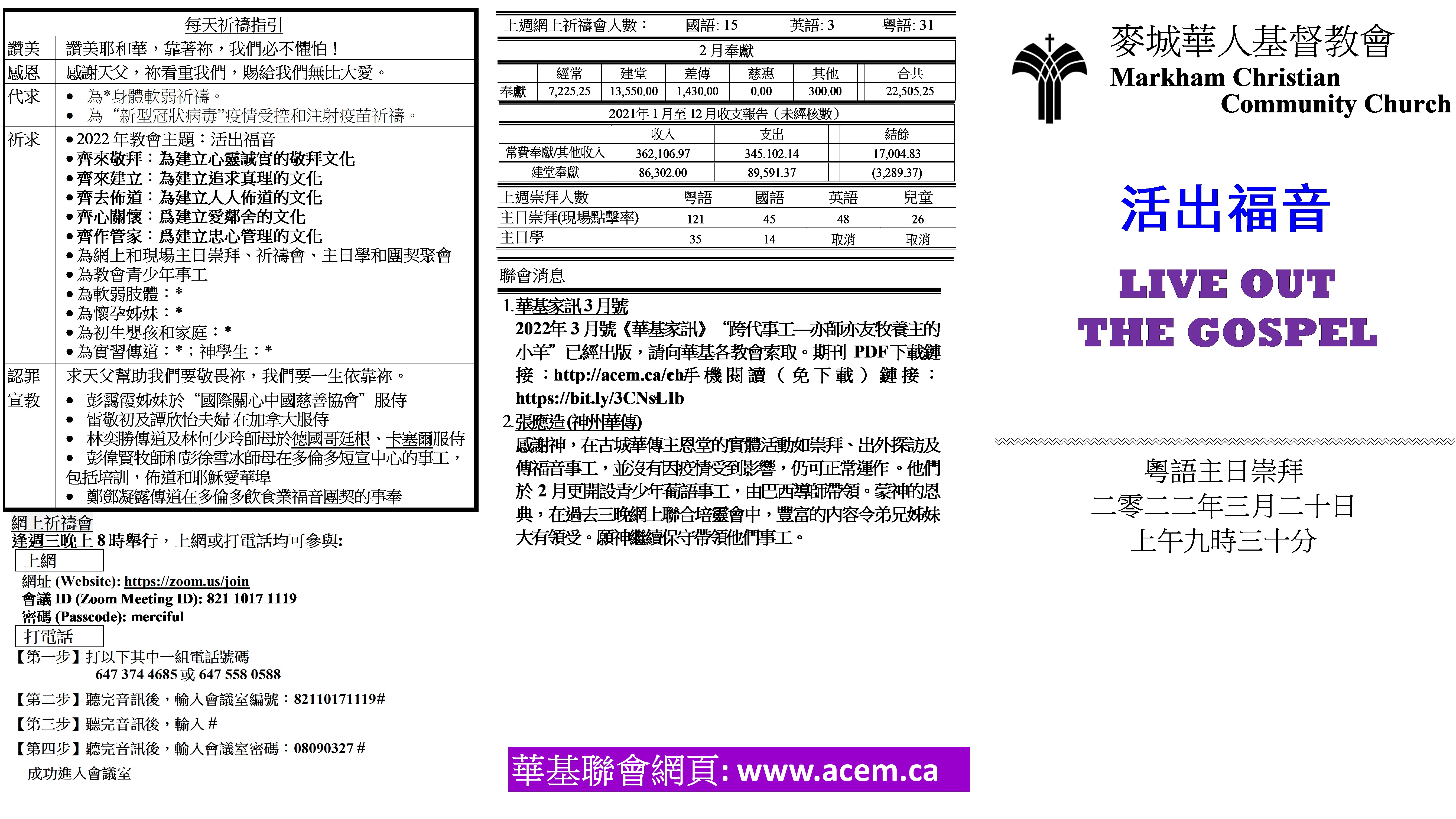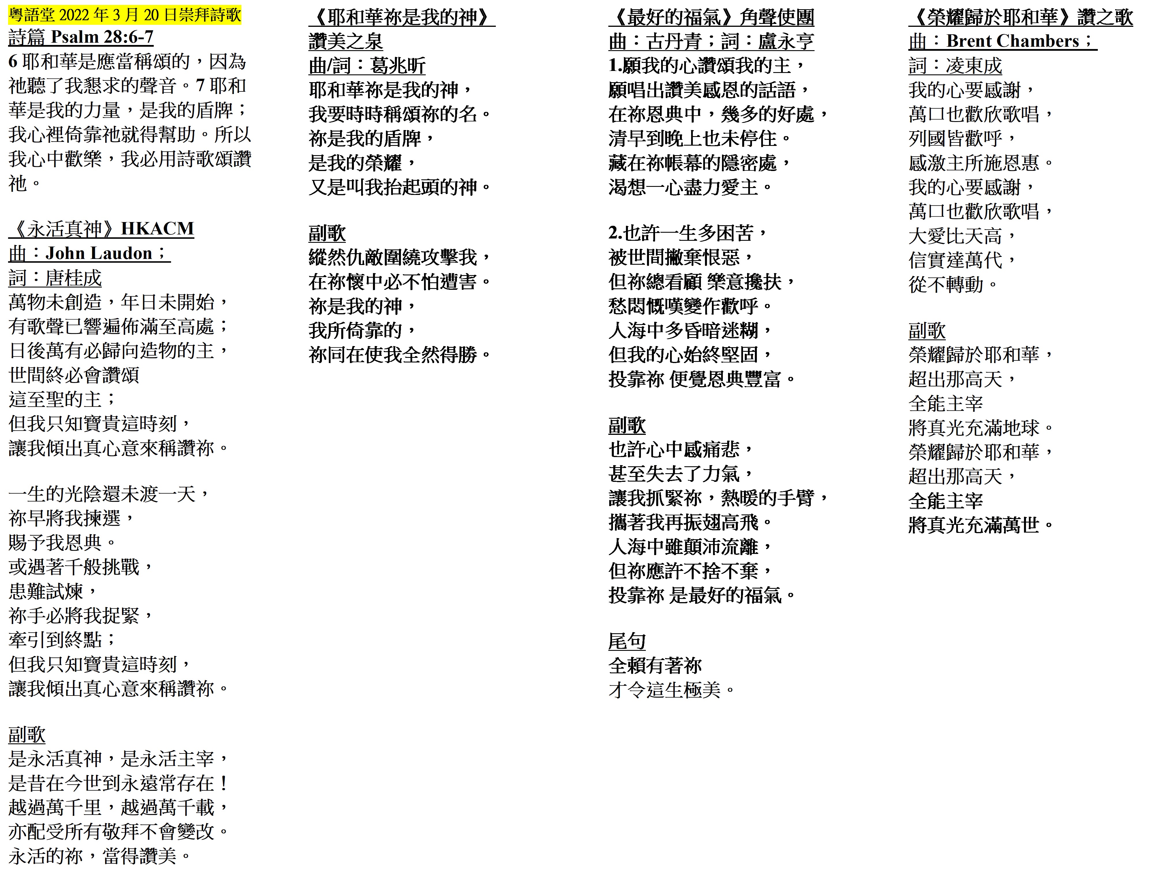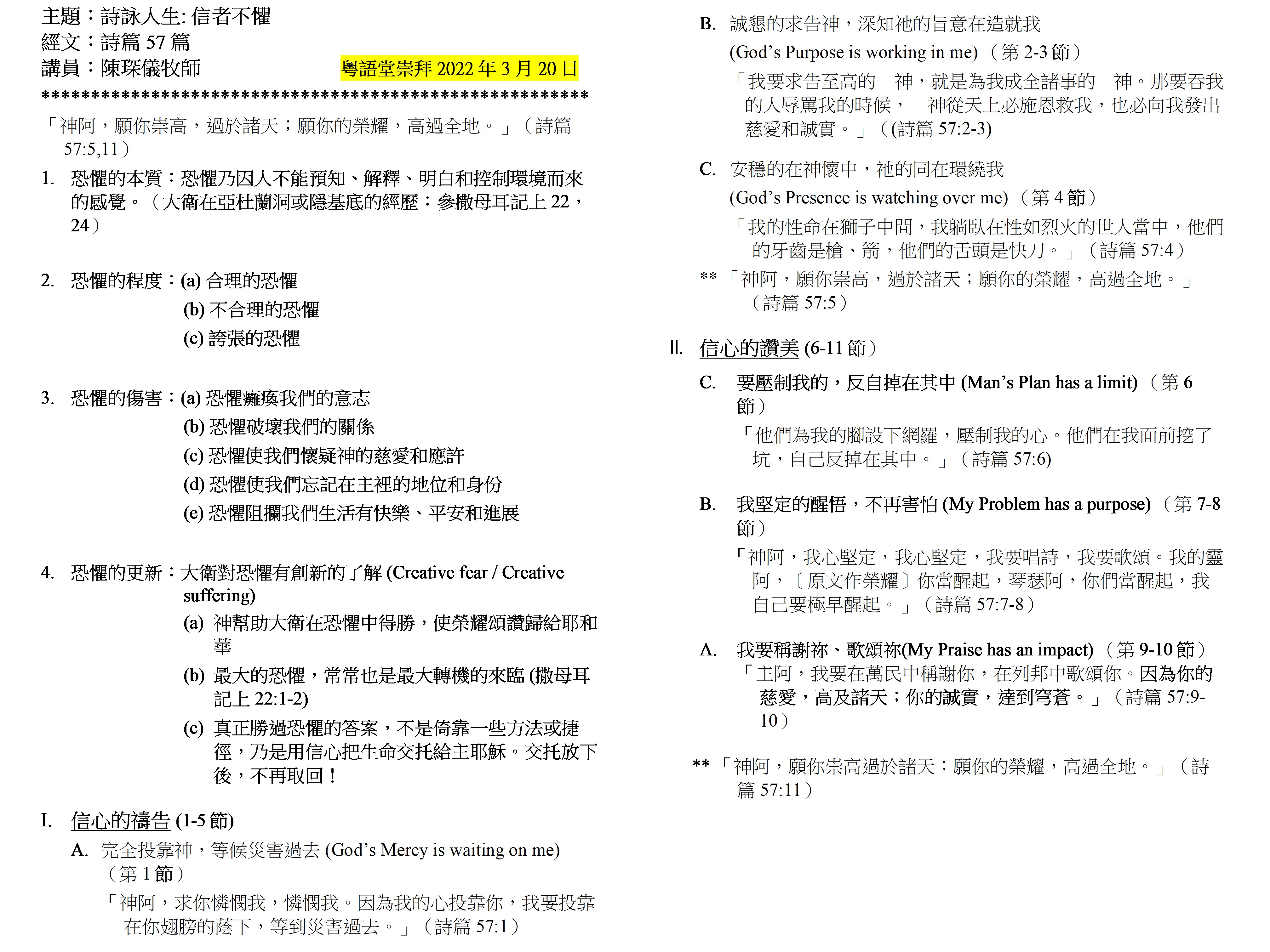 Cantonese Bulletin 崇拜程序表 主日崇拜 2022年3月20日 主題:詩詠人生系列:信者不懼 主題經文:詩篇 Psalm 57:1-11 講員:陳琛儀牧師 崇拜程序表第1頁 崇拜程序表第1頁 崇拜程序表講道大綱 崇拜程序表講道大綱 崇拜程序表第2頁 崇拜程序表第2頁 崇拜程序表第3頁 崇拜程序表第3頁 崇拜歌詞 崇拜歌詞 華基家訊3月號網上版